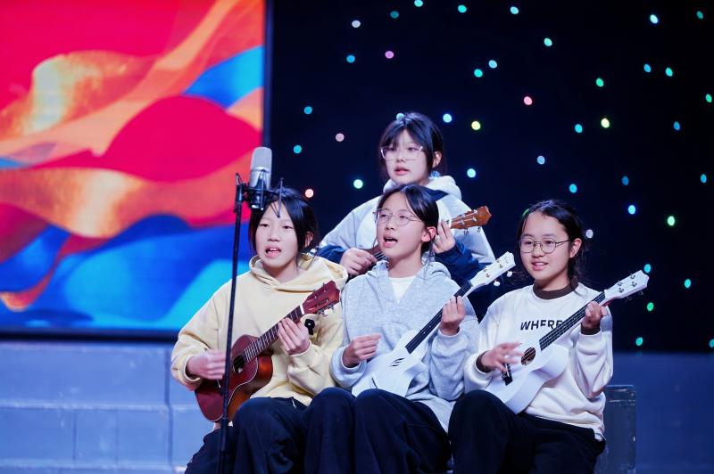 器乐社团先后呈现了尤克里里弹唱《童年》与古筝竹笛合奏《探窗》,前者以轻快旋律唤起纯真记忆,后者以婉转清音推开一扇意境之窗。七(1)班全体同学则以铿锵朗诵与激昂歌唱演绎《龙魂·新章》,诵出文化自信,唱响少年壮志。
