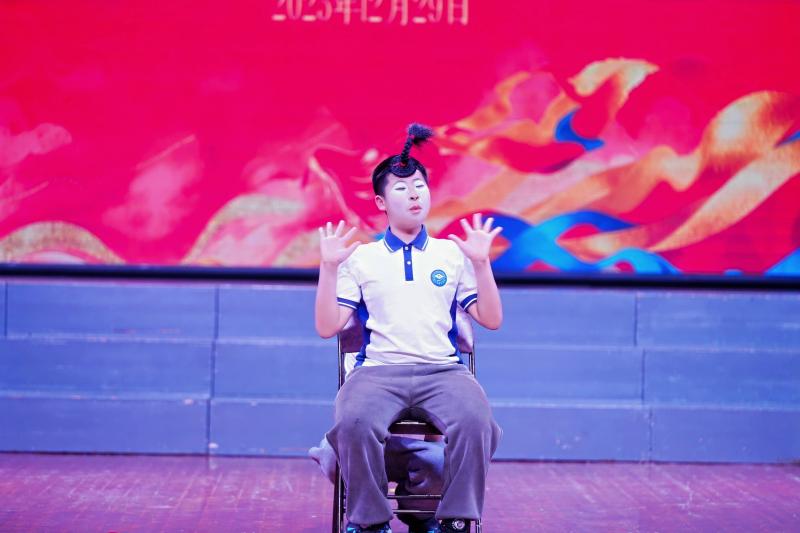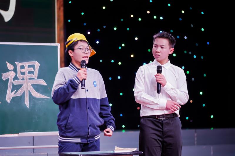 成长,始终是校园艺术中最深刻的主题。本届晚会中,同学们用幽默诠释日常,以勇气面对挑战。成长的故事,在幽默中蕴含智慧。七(3)班的双簧《我们的故事》,以默契的表演诉说青春心事;七(2)班的脱口秀《学沫进化史》,用诙谐的语言直面学习困惑,引发全场共鸣;追风团队的化妆相声《小明的语文课》,则在笑声中重现课堂趣事,致敬教学相长。