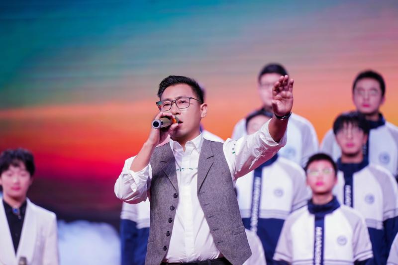 语言类与综合类节目则趣味与深意兼具,笑点与感动并存。高二1、2班同学演绎的小品《妈呀!新老师》,以幽默诙谐的台词、生动鲜活的表演,再现了新老师入职后的趣味日常;张杨老师与高一2班同学们合作的《少年中国说》,则瞬间切换画风——慷慨激昂的吟诵声响彻剧院;高三教师团队带来的朗诵《逐梦高三》,一字一句饱含师者的殷切期许与深情陪伴;高二教师合唱《一个像秋天一个像夏天》,温柔的旋律缓缓流淌,让剧场内暖意融融。