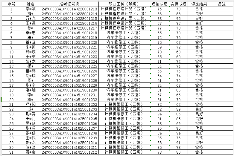 黄山炎培职业学校(黄山市技工学校)于2024年11月30日,开展了汽车维修工(中级)、计算机程序设计员(中级)、计算机维修工(中级)一个批次的职业技能等级认定。现将认定结果(见附件)予以公示。