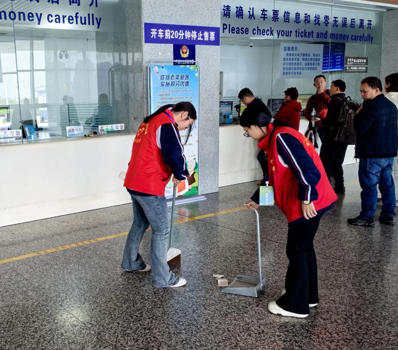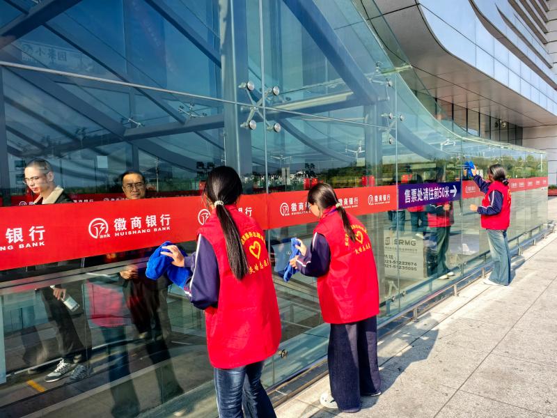 活动开始前,北站派出所朱毅警官为志愿者们做了安全培训。志愿者们身着统一服装,手持清洁工具,化身为高铁站的“美容师”。活动中,他们分工明确,配合默契,对候车大厅的座椅、安检通道、售票窗口以及站前广场的卫生死角进行了细致的清理。同学们不惧辛劳,俯身擦拭,弯腰拾捡,用实际行动践行着“奉献、友爱、互助、进步”的志愿精神,他们忙碌的身影和青春的笑容,成为了车站里一道亮丽的风景线,赢得了车站工作人员与往来旅客的频频赞许。