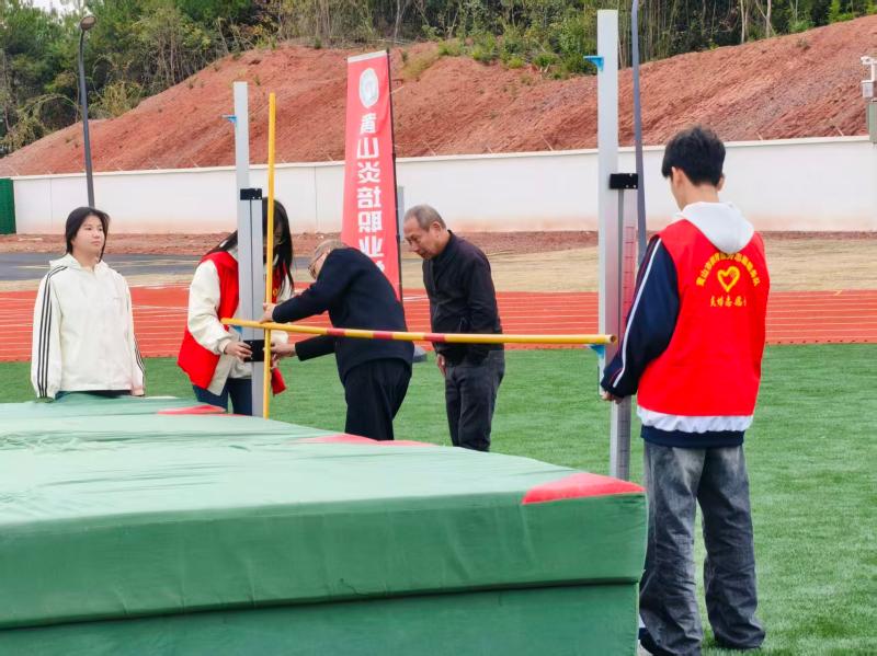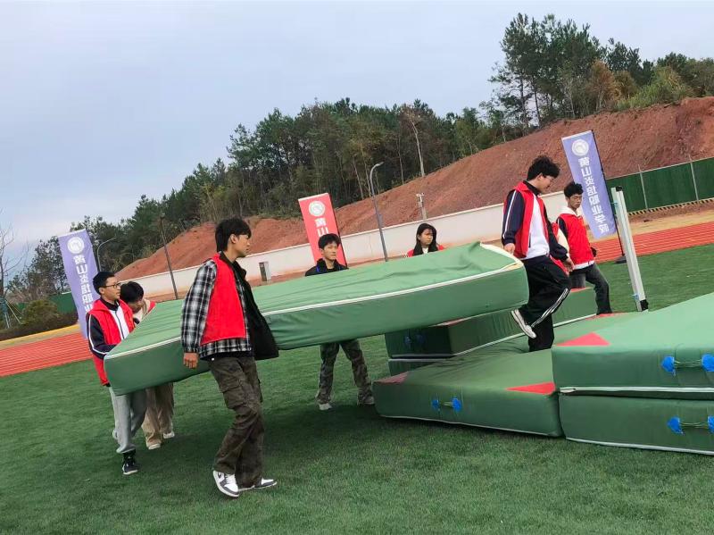 器材保障组按赛程提前将跳高架、跳高垫子、沙坑耙子等运动器材搬运至赛场地,赛后15分钟内完成清点归位,全程零延误、零磕损。