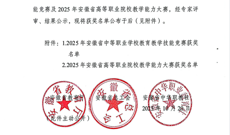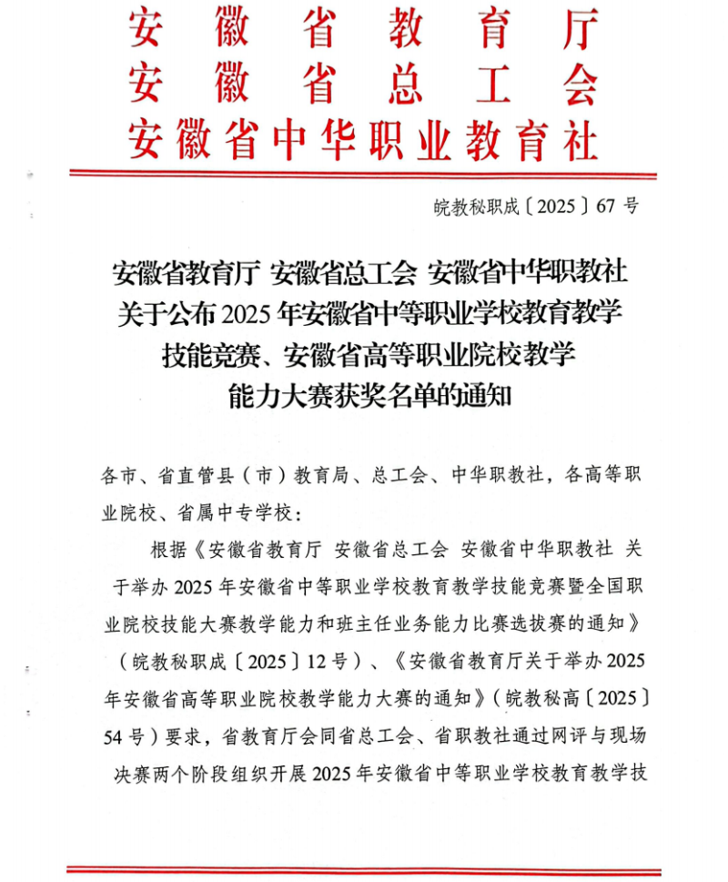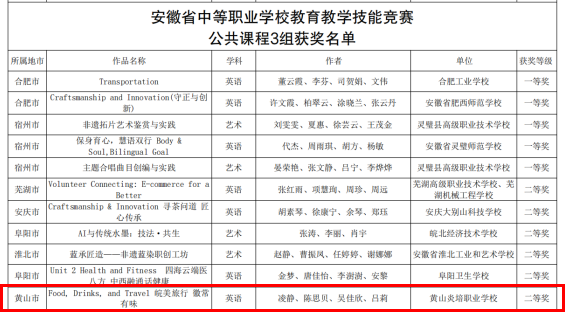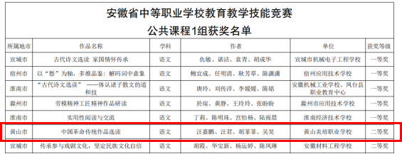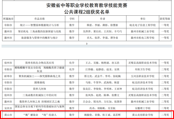 近日,由安徽省教育厅、安徽省总工会、安徽省中华职教社共同主办的2025年全省中等职业学校教育教学技能竞赛圆满落幕,获奖文件正式下发。黄山炎培职业学校教师团队在此次高水平的教育教学能力比拼中奋勇争先,取得了历史性的突破,共斩获二等奖3项、三等奖2项,充分展现了教师们扎实的教学功底和优秀的团队协作精神。