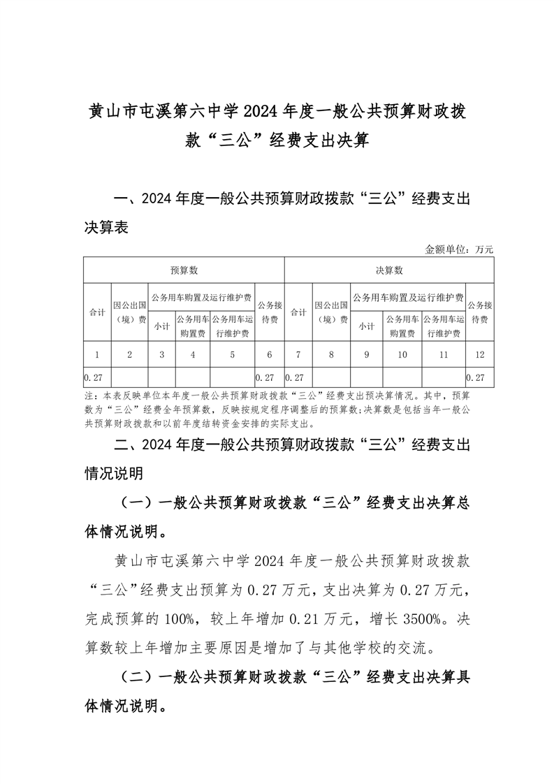 黄山市屯溪第六中学2024年度一般公共预算财政拨款“三公”经费支出决算