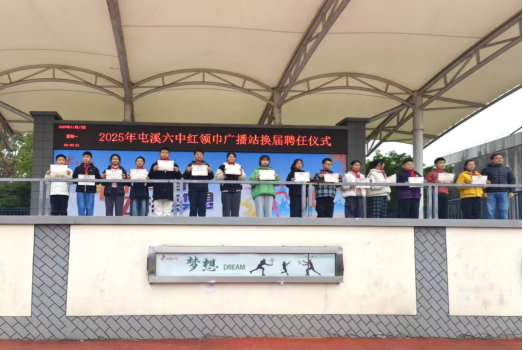 为进一步丰富校园文化生活,打造高素质的红领巾广播站团队,充分发挥校园广播的育人功能,10月30日,屯溪六中七年级红领巾广播站广播员选拔活动在多功能报告厅顺利举行,并于11月17日晨会进行了聘任仪式。本次选拔创新性融入“导—师—制+”理念,为怀揣声音梦想的少年搭建了展示自我、逐梦成长的优质平台。