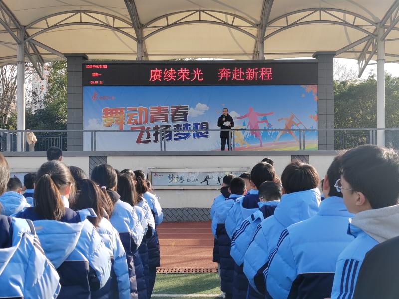 1月12日,屯溪六中2026年首次升旗仪式在操场举行,全校师生齐聚见证新程开启。党支部书记、校长谢德暹以首席导师的身份发表讲话,与师生共启新年篇章。