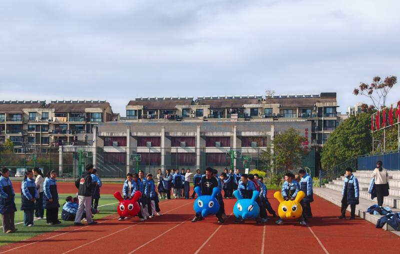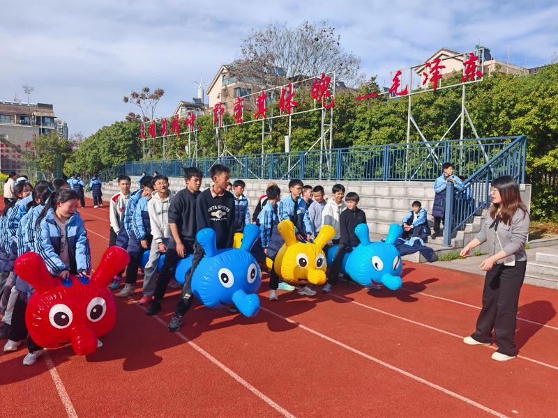 在核心环节充气毛毛虫竞速中,同学们以6人为一组,骑跨充气毛毛虫协同前进。方康老师细致讲解规则、强调安全要点,确保活动有序开展;尹晓倩老师全程观察学生表现,适时引导小组讨论步伐协调、沟通配合、情绪调整等问题,让学生在竞技中体会合作、在互动中学会包容。