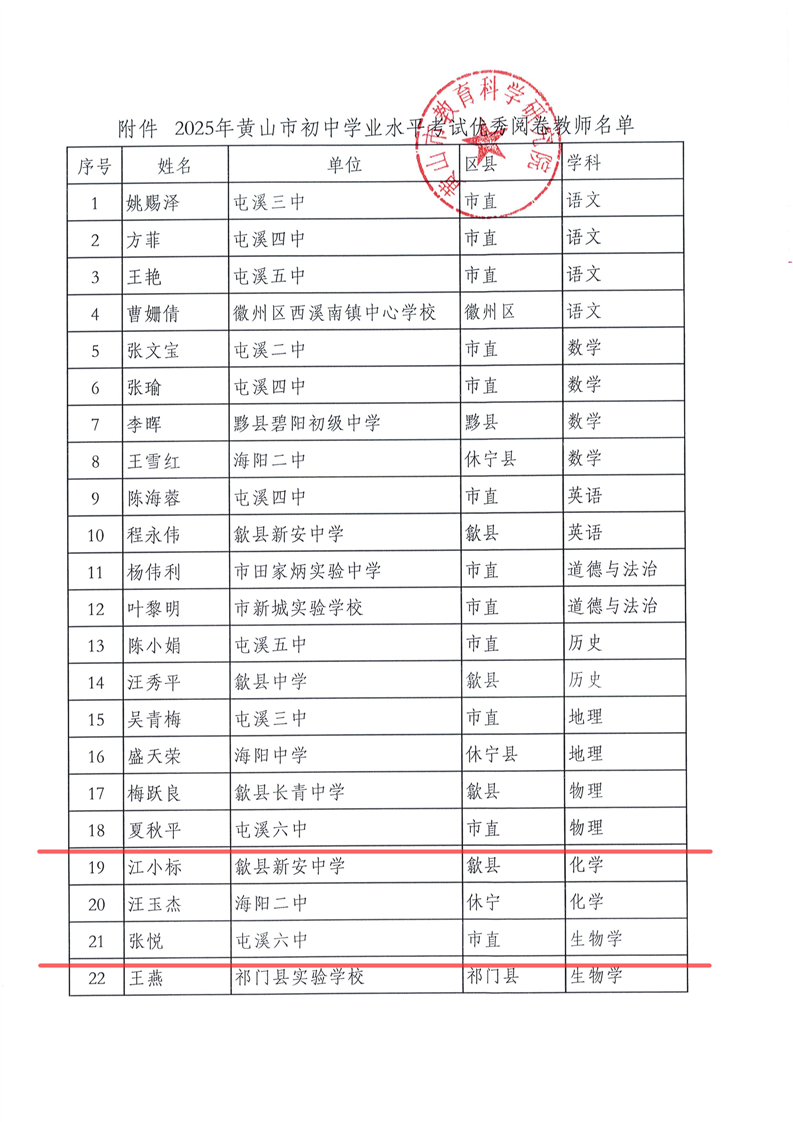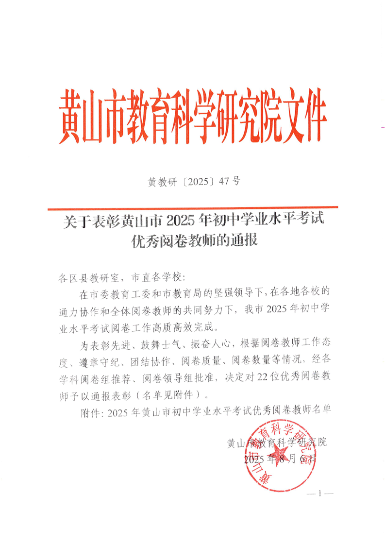 47号 关于表彰黄山市2025年初中学业水平考试优秀阅卷教师的通报