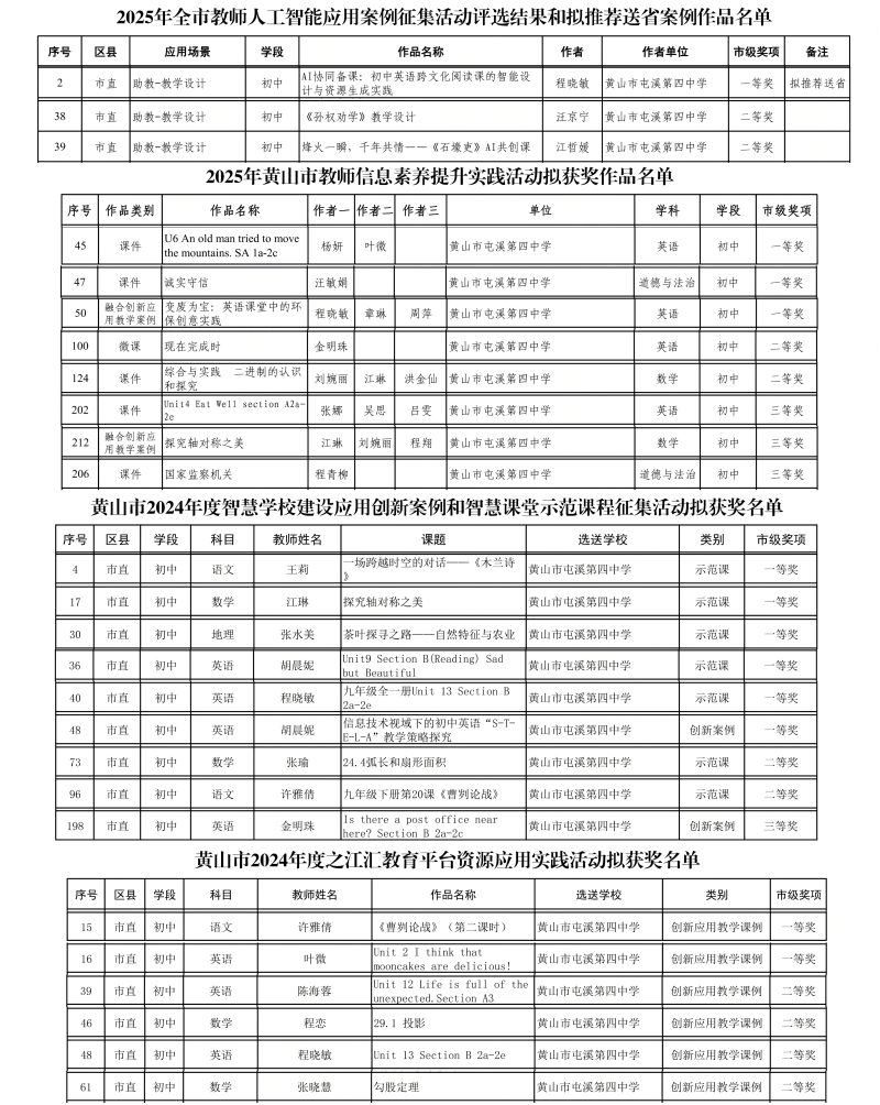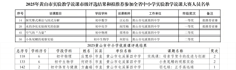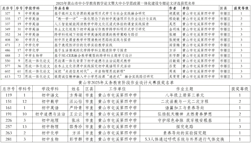 我校一直扎实推进教研工作,鼓励教师凝练优秀教研成果,助力青年教师专业成长。在2025年黄山市中小学教育教学论文评选和义务教育阶段作业设计大赛中,我校9人获市一等奖,4人获市二等奖,8人获市三等奖。