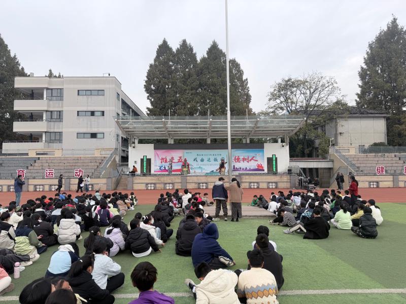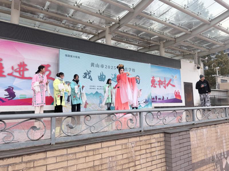 活动现场,经典剧目轮番上演:黄梅戏《天仙配·鹊桥四赞》以婉转唱腔演绎动人爱情,徽剧《水淹七军》的铿锵身段尽显英雄气概,徽剧《扈家庄》《贵妃醉酒》则将戏曲的身段美、韵律美展现得淋漓尽致。演员们专业的表演、精致的扮相,让师生们近距离领略了黄梅戏的柔美与徽剧的厚重。