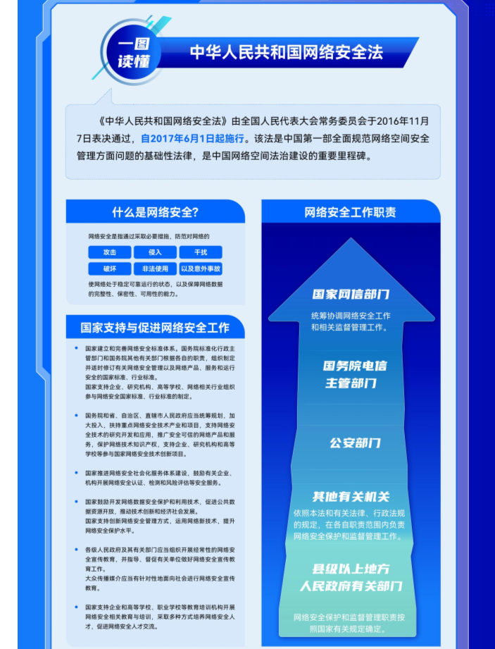 明确立法目的为保障网络安全,维护网络空间主权和国家安全等。规定在我国境内网络相关活动及监督管理适用本法。还阐述了国家网络安全工作方针、战略,以及相关部门职责等,同时要求网络运营者履行安全保护义务,鼓励行业组织自律,强调保护公民等网络使用权利,禁止利用网络从事危害国家安全等违法活动,鼓励公众举报网络安全违法行为。
