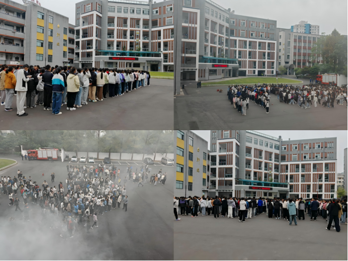 随着广播警报响起,各班师生迅速响应,660名学生立即从教室前后门离开,躬身捂住口鼻从消防通道迅速撤离,仅在2分钟的时间内就成功完成了集体疏散,学生严肃认真,秩序井然。