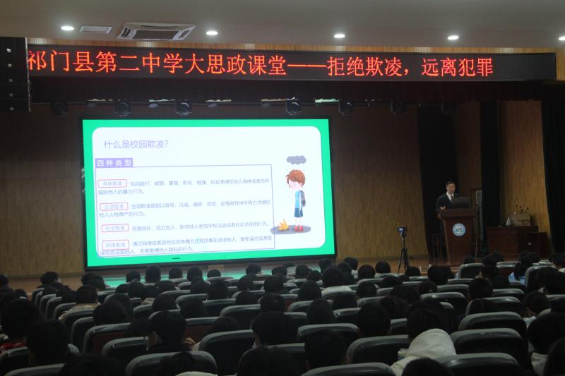12月4日,祁门县第二中学邀请校外导师学校法治副校长、祁门县人民检察院检察官郑嘉玮,祁山派出所指导员程帮桂,为全校师生举办了一场主题为“拒绝欺凌,远离犯罪”的法治专题讲座。