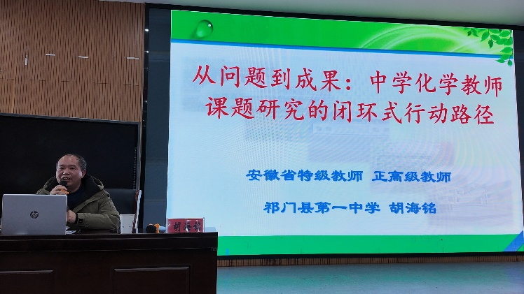 黄山市中学化学名师工作室主持人特级教师、正高级教师胡海铭带来《从问题到成果:化学教师课题研究的闭环式行动路径》专题报告,明确课题研究是教师专业发展的重要途径,围绕增强问题意识、选定研究论题、设计研究方案、确定研究方法、撰写研究报告、成果应用推广六大环节细致讲解。他强调,教师要从教学实际中捕捉研究问题,确保论题兼具针对性与创新性,以科学方法开展研究,注重数据支撑,推动研究成果反哺教学,形成“教学—研究—教学”良性循环,同时还针对课题申报书撰写的定位、推演、分析等关键环节给予精准指导。