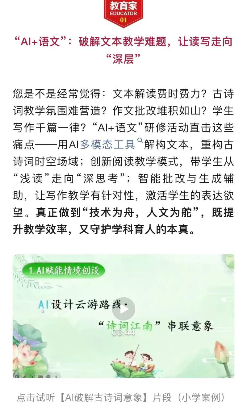 此次研修视频紧扣一线教学痛点,以“情境任务+AI实操”为核心,分层呈现小学、初中、高中不同学段的AI教学案例,让启航一组成员直呼“解渴”。在“AI+语文”板块,从AI多模态工具解构文本、重构古诗词时空场域,到智能批改激活学生写作欲望,“技术为舟,人文为舵”的理念打破了成员们对文本教学的固有认知——原本耗时费力的文本解读、氛围难营造的古诗词课堂,在AI助力下可转化为引导学生“深思考”的沉浸式学习场域;而“AI+数学”板块中,动态建模让公式“活”起来、图像生成让函数“看得见”的实操演示,更让成员们找到破解“抽象概念难讲、分层教学难落”的关键钥匙,深刻理解“精准施策、思维主导、技术增能”三位一体的课堂新逻辑。