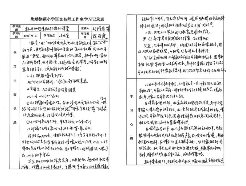 学习过程中,启航一组成员围绕视频中的小学《AI破解古诗词意象》、初中《AI设计单元学习任务》、高中《AI备课的基本实践路径》等典型案例展开热烈研讨。大家结合自身教学实际,分享过往困惑,对照AI工具的应用场景梳理解决方案,一致认为:AI不是替代教师的“对手”,而是解放重复劳动、聚焦创意教学的“智能助手”。未来教学中,需善用AI分析学情、设计个性化学习路径,将技术深度融入备教学评全流程,真正实现“以学定教、精准育人”。