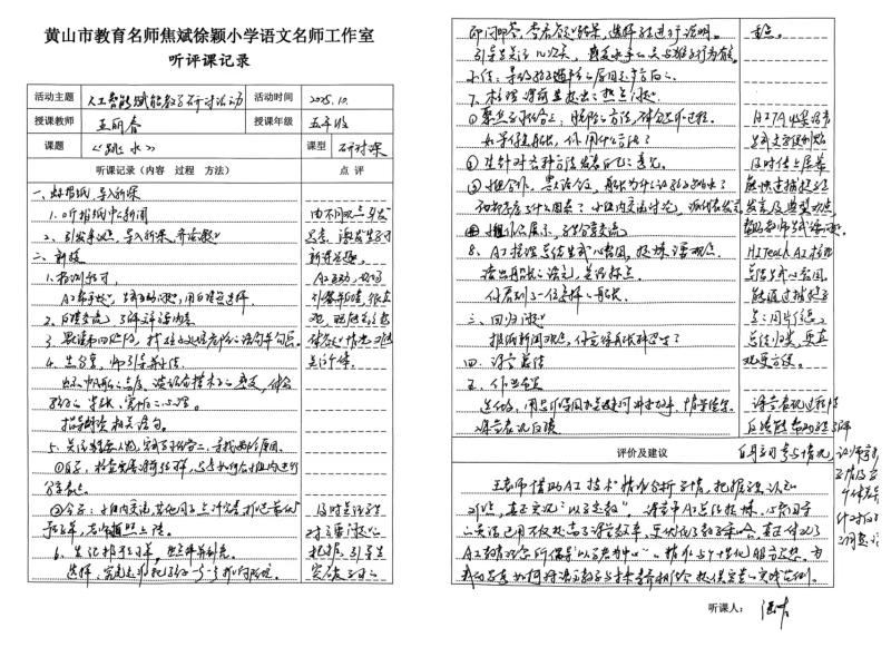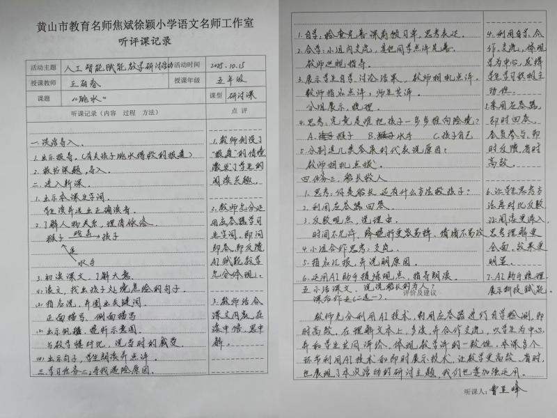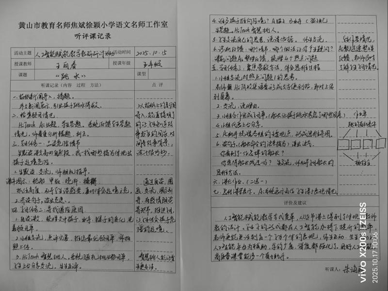 观摩结束后,工作室成员围绕课例《跳水》展开深度研讨。大家聚焦于三个关键维度:一是AI技术介入的适切时机与教学节点;二是“教师主导”与“技术辅助”之间的有效平衡;三是AI校本化实施的可能路径与现实挑战。成员们在交流中碰撞思想,在反思中凝聚共识,进一步明晰了技术如何真正服务于语文教学的本质与内核。
