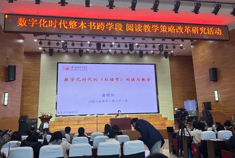 除此之外,我们还聆听了安徽师范大学文学院俞晓红教授的讲座,俞教授深耕《红楼梦》研究与语文教学多年。讲座中,她以“长篇小说故事应该如何把握”“分析小说人物需要关注什么”等相关问题,从阅读革新、教学优化等多个维度为我们答疑解惑,并明晰了数字化时代《红楼梦》阅读与教学的核心原则,又提供了可操作的策略方法,为我们古典名著教学革新指明了方向。