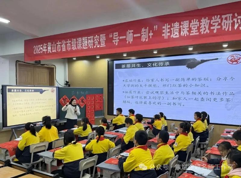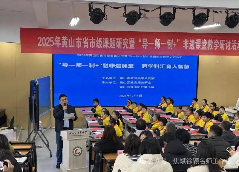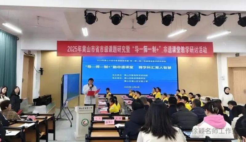 冬日暖阳映金边,非遗课堂展新篇。为深入推进黄山市省市级课题的研究工作,落实“导-师-制+”非遗课堂实践模式,12月4日,一场以“非遗传承与学科融合”为主题的“导-师-制+”非遗课堂教学研讨活动在黄山区甘棠小学顺利举行。活动以精品课例展示、课题成果分享、专家精准点评为核心环节,集中呈现了工作室成员及区域教师在非遗与小学语文教学深度融合领域的实践探索与理论沉淀,彰显了工作室 “以研促教、以文化人、共育良师” 的发展理念,培养了工作室成员的专业能力,助力他们成长为有扎实的专业素养、有娴熟的教学艺术、有深厚文化传承情怀的导师。