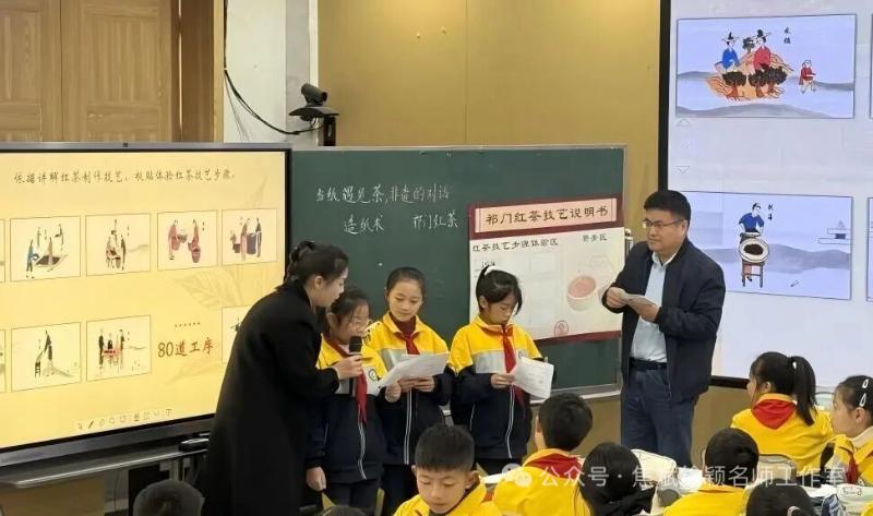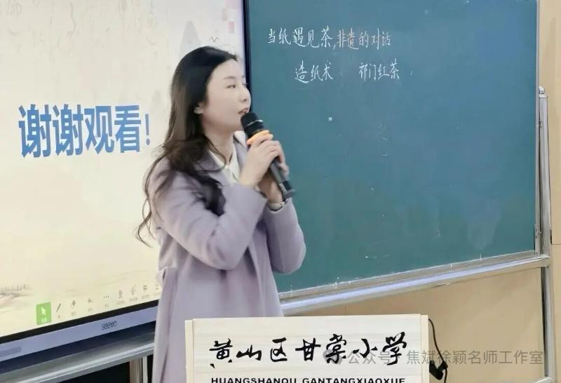 黄山市焦斌徐颖名师工作室成员、祁门县阊江小学青年教师余婷婷执教的《当纸遇上茶》一课,以课文《纸的发明》为依托,与“祁门红茶技艺”巧妙融合,构建起“语文+非遗”的跨学科教学新范式。课堂上,余老师引导学生梳理造纸的工序,总结出说明性文本的写法,并迁移至“祁红小茶人讲解员”的实践活动中。学生在探究红茶制作过程中感悟劳动智慧,并通过为祁门红茶设计包装、撰写宣传语等实践活动,实现知识的综合运用与创新,有效呼应了新课标对跨学科主题学习的要求。
