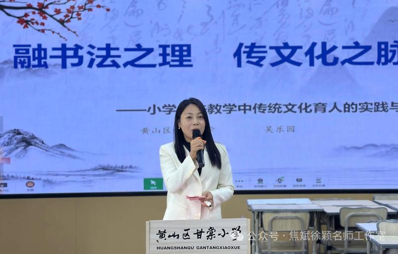 黄山区甘棠小学吴乐园老师分享的课题《小学书法教学中传统文化育人的实践思考》,聚焦书法教学,提出“以技育人、以美育人、以文化人”的实施路径,探索“书法+经典”“书法+文化”“书法+生活”等教学策略,打破传统书法教学“重技能、轻文化”的局限,使书法课堂成为培育学生文化自信、审美素养与品德修养的重要平台。