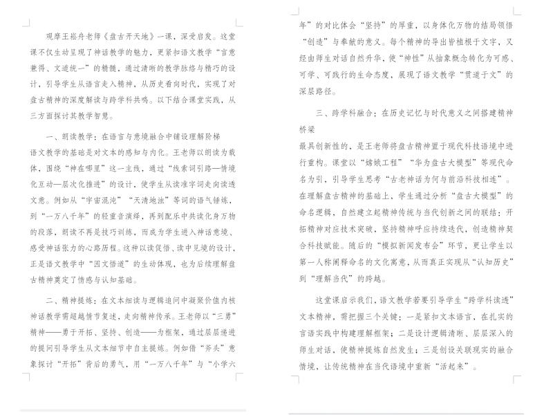 研讨强调,语文教学的精髓在于“以文为本、以言育人”。神话教学应避免空泛说教,而要通过具体的语言文字品读,让学生从“盘古睡一万八千年”中读坚持,从“斧劈黑暗”中读勇气,从“化身万物”中读奉献。在此基础上,自然勾连科学、历史、美术等多学科视角,例如:结合科学课“力的作用”,理解“开天辟地”的力量隐喻;关联当代航天精神,探讨“顶天立地”的当代诠释;通过美术创作、研学实践,将精神感悟转化为具象表达。