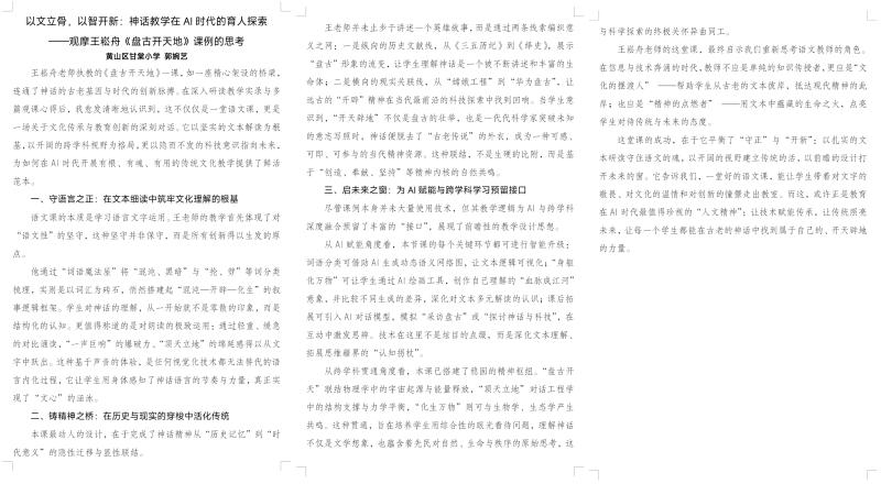 研讨中,大家认为,王老师的课例启示我们:科技不是传统文化的背离,而是其活化传承的新载体。例如,可借助AI生成“盘古开天地”动态画面,让学生“亲眼见证”神话场景;或利用AI工具绘制“神话精神图谱”,梳理“混沌—开天—化身”的叙事逻辑;还可设计“如果盘古活在今天”科幻写作任务,引导学生以AI辅助创作,在古今对话中深化对“开拓、坚持、创造”精神的理解。