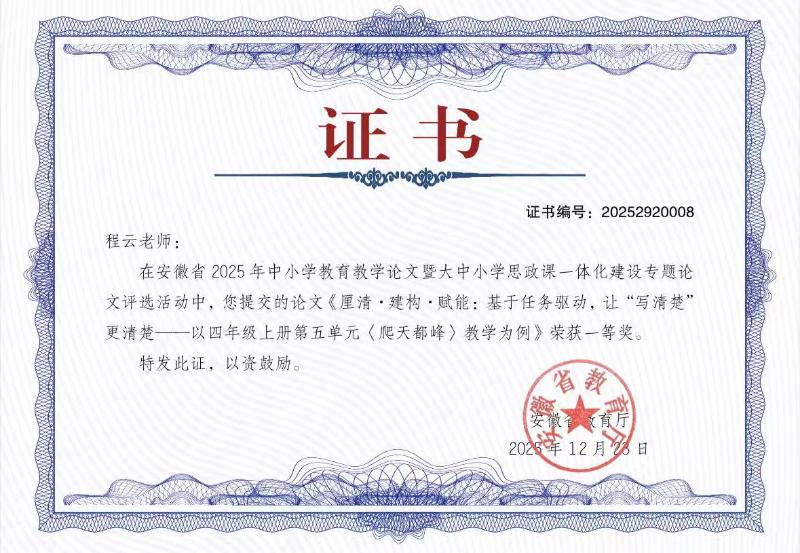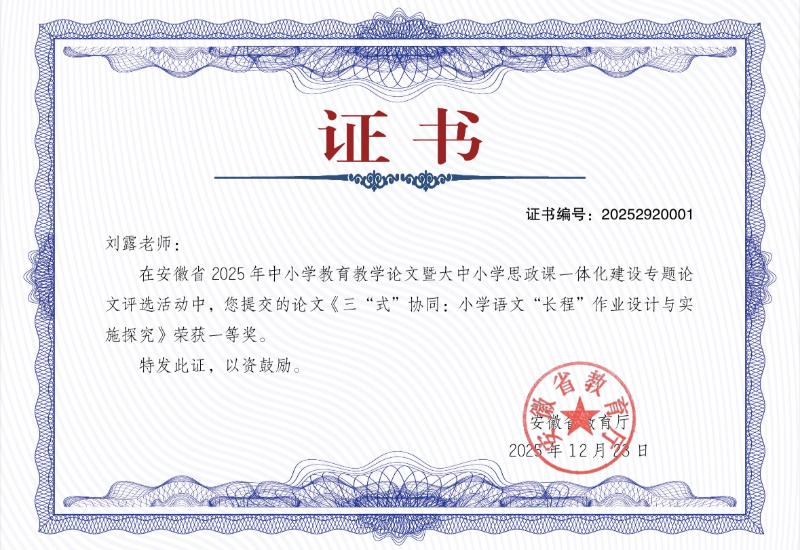 寒冬传捷报,耕耘获佳绩。近日,从安徽省2025年中小学教育教学论文暨大中小学思政课一体化建设专题论文评选活动传来喜讯,黄山市小学语文组教师表现优异,共有13位教师荣获省级奖项。焦斌徐颖名师工作室多名成员获奖,其中,刘露老师凭借出色的研究成果,荣获省级一等奖第一名,展现了工作室教师队伍扎实的教研能力和专业素养。