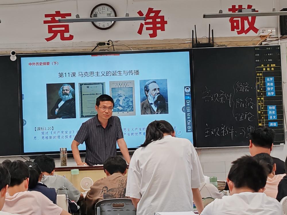 孙老师一行首先听了工作室成员、黄山一中翟素芳老师的高三复习课,主题为《中法关系热点专题》,这节课,选择了中法关系作为高三三轮复习内容,是高频考点热点巩固的专题训练,所讲内容体现了知识为基、能力为重、素养导向、价值引领的学科导向。然后,大家还听了吴义福副校长高一理科班的《马克思主义诞生与传播》。