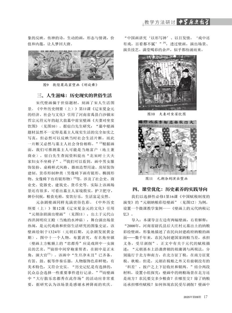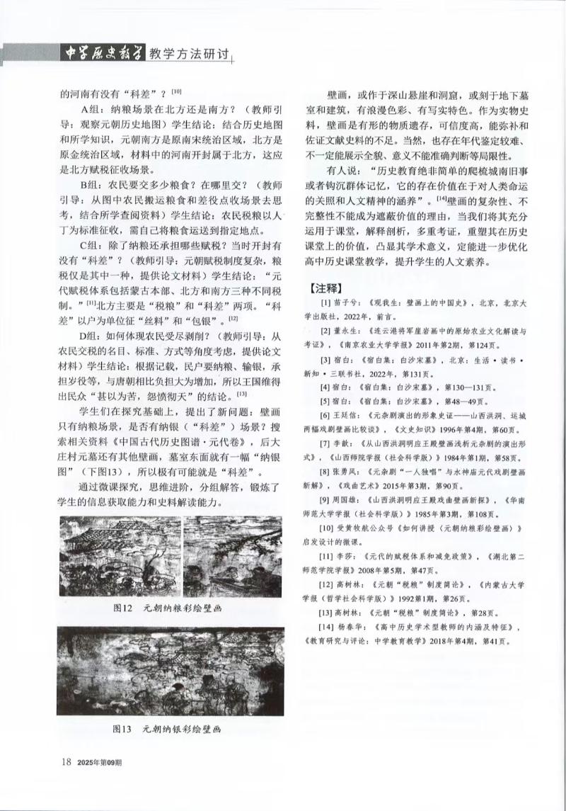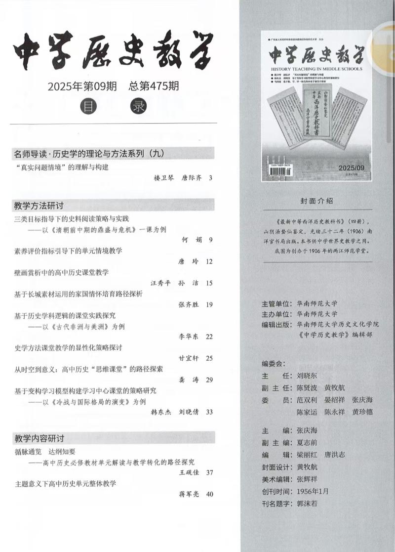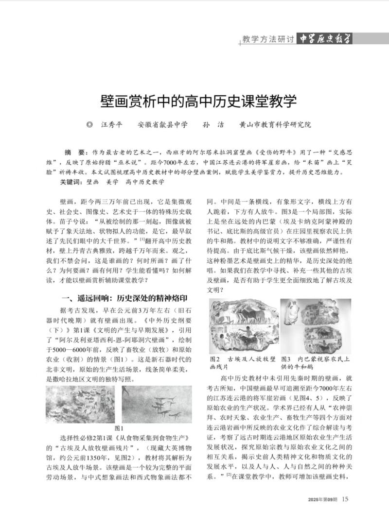 《中学历史教学》2025年第9期,刊发了安徽省歙县中学汪秀平老师和黄山市教育科学研究院孙洁老师合作完成的文章《壁画赏析中的高中历史课堂教学》。 汪秀平老师,歙县中学历史教师,历史学硕士,歙县历史学科骨干教师、兼职教研员,曾获安徽省优质课团体二等、个人三等奖,安徽省论文评选一等奖。 孙洁老师,是黄山市教科院历史学科教研员,安徽省特级、正高级教师,第三届安徽省教坛新星、市名师工作室主持人,有市名教师、学科带头人、优秀教师、优秀班主任等多项荣誉。优质课、论文、微课等多次荣获省级、国家级一等奖,发表论文多篇,编写过黄山市乡土历史读本《大美黄山》。 孙老师是汪老师高中三年的班主任和历史老师,当学生成为同行,师生作为同事,共同完成研究,是令人羡慕的缘分。