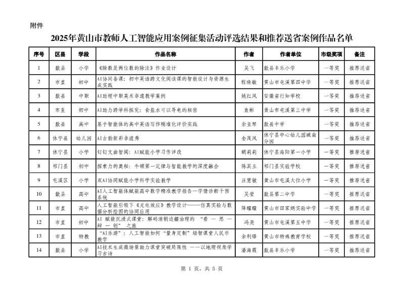 根据安徽省教育厅办公室《关于组织开展教师人工智能应用案例征集活动的通知》(皖教办函【2025】92)和《关于组织开展黄山市教师人工智能应用案例征集活动的通知》(黄教电【2025】10)精神,向全市教师开展的人工智能应用案例征集活动。经专家组评审公示,本次活动共评选出市级一等奖作品20件,二等奖作品22件,三等奖作品28件,其中有20件作品被推荐参加省级评选。