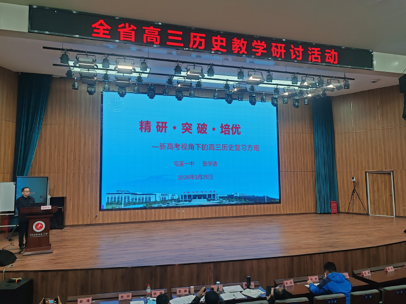 为深入落实新修订课程标准理念,加强全省高三历史教学指导,促进教学经验交流,安徽省教育科学研究院于2026年3月25日在淮北市第一中学成功举办全省高三历史教学研讨活动。本次活动主题为“基于新修订课标理念的高三历史教学”,由安徽省教育科学研究院主办,淮北市教育科学研究所承办,淮北市第一中学、淮北市高中历史田磊名师工作室、芜湖市刘宏法劳模创新工作室共同协办。来自全省各地市的教研员、高中历史教师等170余人参与线下研讨。黄山市高三历史骨干教师11人参加了培训。