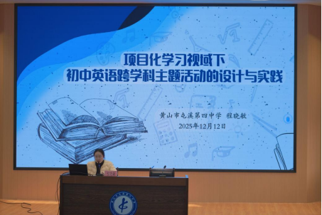 活动伊始,屯溪四中程晓敏老师带来了题为《项目化学习视域下初中英语跨学科主题活动的设计与实践》的专题讲座。她不仅系统阐述了项目化学习与跨学科主题融合的理论框架,还以生动详实的实践案例向大家深入剖析了如何设计具有驱动性的真实任务,为学生创设真实、综合的语言运用情境。
