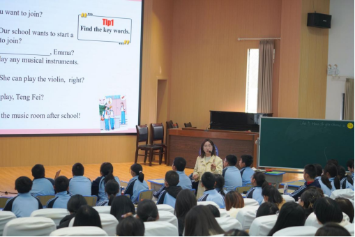 在青年成员汇报课环节,屯溪六中余舒娟老师展示了人教版新教材七年级上册Unit 5 Fun Clubs Section A 2a-2e的课例。她以寻找俱乐部成员为任务驱动,借助人工智能赋能,设计贴近学生实际的语言任务,在轻松互动中提升学生的听说能力与合作精神。