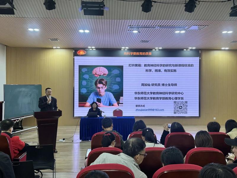 为引领教育教学从科学角度认识教育现象、解读教育规律、改善教育实践,有效赋能教育高质量发展,10 月 24 日,徽州区教育局邀请华东师范大学教育学院研究员、华东师范大学教育神经科学研究中心副主任周加仙教授,作《打开黑箱:教育神经科学与新课标的科学有效实施》专题报告。此次报告会由徽州区教育局教研室主任万欣主持,市教科院心理兼职教研员张红红老师带领黄山市中小学心理健康教师及姚丽云心理健康名师工作室成员 50 人参会,徽州区各学校 150 名一线教师也参与其中。