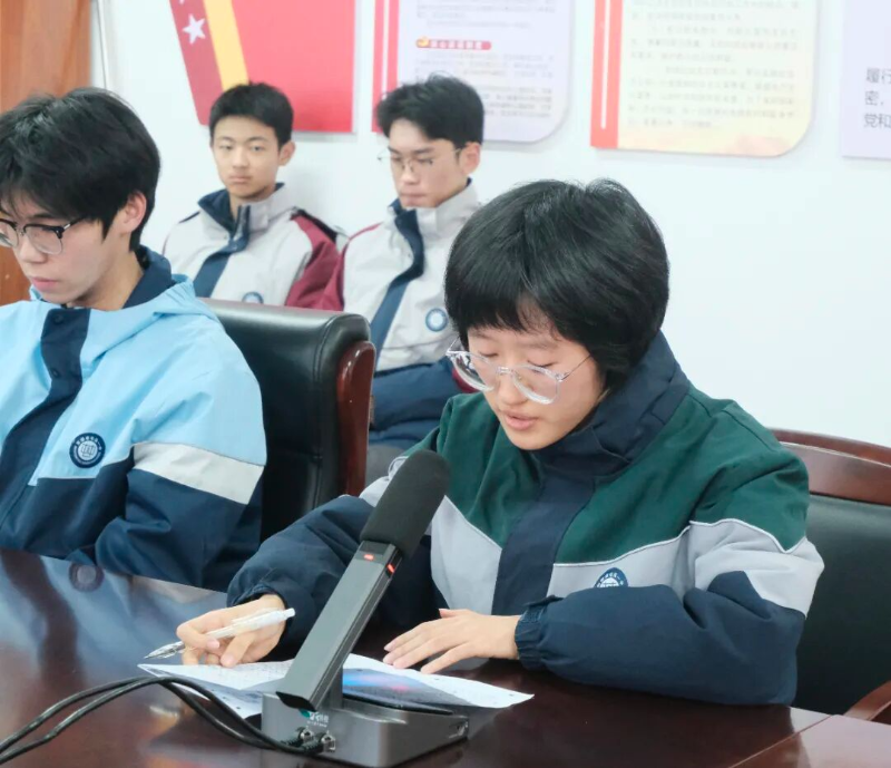 三位“军娃”代表分享成长感悟。高一2班李泽恺同学畅谈军训国旗班经历;高二3班周闽皓同学讲述军人家风熏陶下的成长故事并立志报考军校;高三14班刘晰晢同学以“等待”为出发点,感悟生活学习点滴并寄语学弟学妹传承军人信念。
