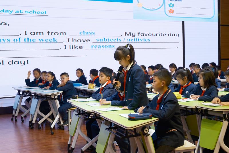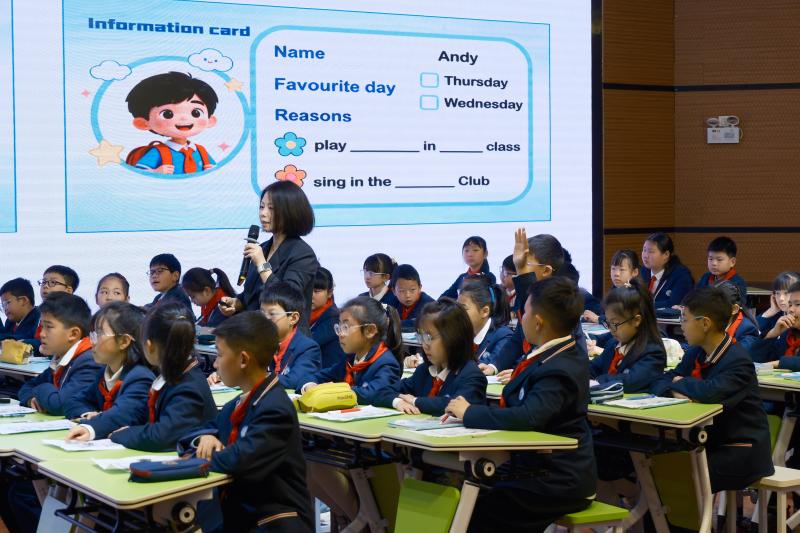 在课例展示环节,华东师范大学第二附属中学前滩学校叶慧老师执教四年级下册“Unit 2 Period 4 What’s your favourite day at school?”示范课。课堂以“校园最爱日”为主线,通过信息卡串联递进式任务,以任务驱动学生主动参与,有效提升综合语言运用能力,为参训教师提供了可操作的课堂范例。